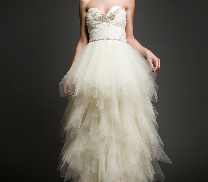 Fusión de modernidad y elegancia, este diseño strapless destaca por su parte superior con bordados en tul sofisticado y delicado y la falda de cortes asimétricos genera una silueta ligera. Una propuesta única para novias que buscan un estilo propio en su gran día.
